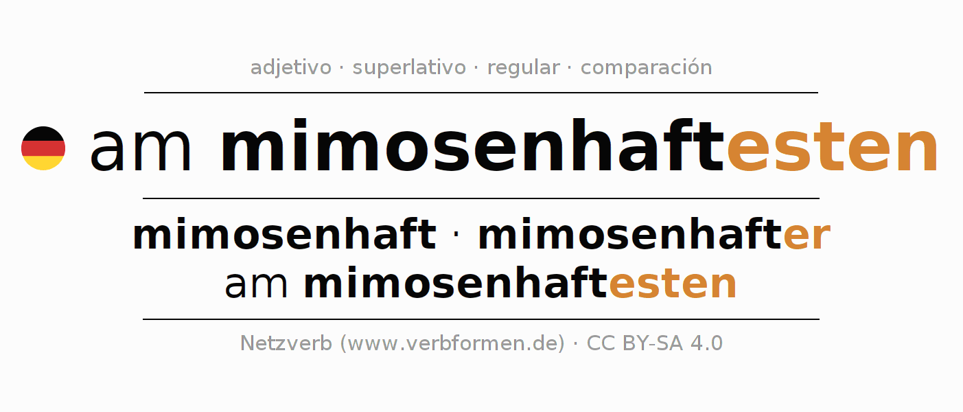 El comparativo en forma de tabla con todas sus formas de declinación: fuerte, débil y mixta. Estas están representadas de forma clara en una tabla sinópica en singular, plural y en los cuatro casos gramaticales: nominativo (primer caso), genitivo (segundo caso), dativo (tercer caso) y acusativo (cuarto caso). Aquí encontraras más información acerca del tema Wiktionary am mimosenhaftesten y aquí también a través del Duden am mimosenhaftesten.