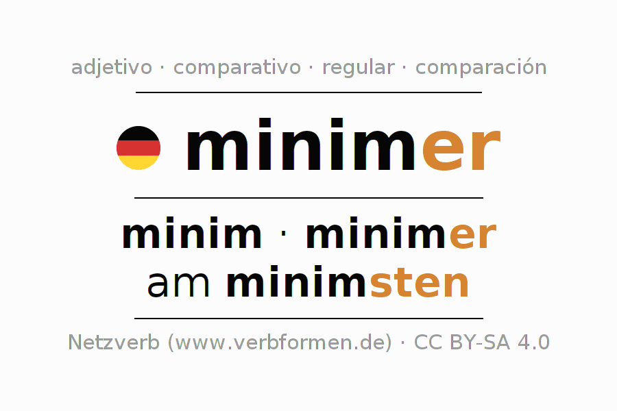 El adjetivo minimer se declina (muy bajo, muy pequeño) utilizando las construcciones de comparación. Las terminaciones necesarias para la exaltación, comparación y el superlativo son er/sten. El adjetivo minimer puede ser utilizado de forma atributiva en frente de un sustantivo así como de forma predicativa en conjunto con un verbo.Aquí puedes declinar y comparar no solamente minimer sino también todos los adjetivos alemanes. Comentarios ☆
