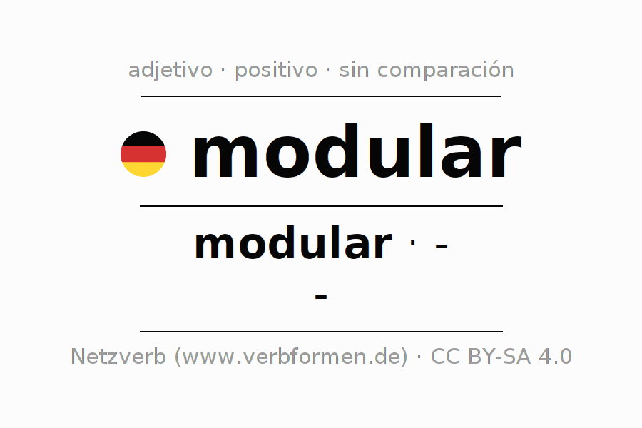 El adjetivo modular se declina utilizando la construcción modular, la cual no puede ser exaltada, es decir este adjetivo no permite formas del comparativo o superlativo. El adjetivo modular puede ser utilizado de forma atributiva en frente de un sustantivo así como de forma predicativa en conjunto con un verbo.Aquí puedes declinar y comparar no solamente modular sino también todos los adjetivos alemanes. Comentarios ☆