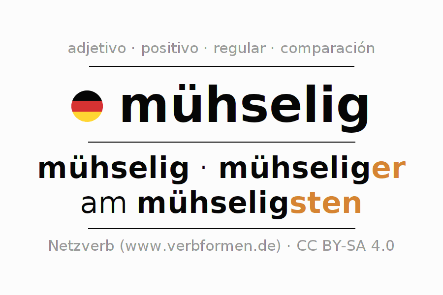 El comparativo en forma de tabla con todas sus formas de declinación: fuerte, débil y mixta. Estas están representadas de forma clara en una tabla sinópica en singular, plural y en los cuatro casos gramaticales: nominativo (primer caso), genitivo (segundo caso), dativo (tercer caso) y acusativo (cuarto caso). Aquí encontraras más información acerca del tema Wiktionary mühselig y aquí también a través del Duden mühselig.