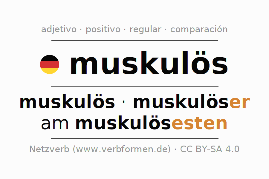 El comparativo en forma de tabla con todas sus formas de declinación: fuerte, débil y mixta. Estas están representadas de forma clara en una tabla sinópica en singular, plural y en los cuatro casos gramaticales: nominativo (primer caso), genitivo (segundo caso), dativo (tercer caso) y acusativo (cuarto caso). Aquí encontraras más información acerca del tema Wiktionary muskulös y aquí también a través del Duden muskulös.