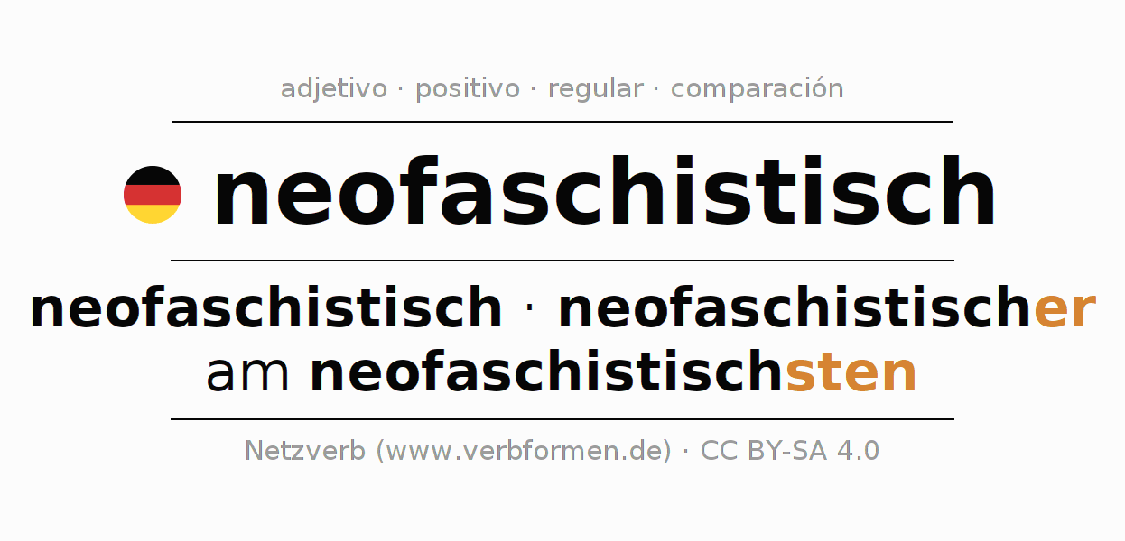 El comparativo en forma de tabla con todas sus formas de declinación: fuerte, débil y mixta. Estas están representadas de forma clara en una tabla sinópica en singular, plural y en los cuatro casos gramaticales: nominativo (primer caso), genitivo (segundo caso), dativo (tercer caso) y acusativo (cuarto caso). Aquí encontraras más información acerca del tema Wiktionary neofaschistisch y aquí también a través del Duden neofaschistisch.