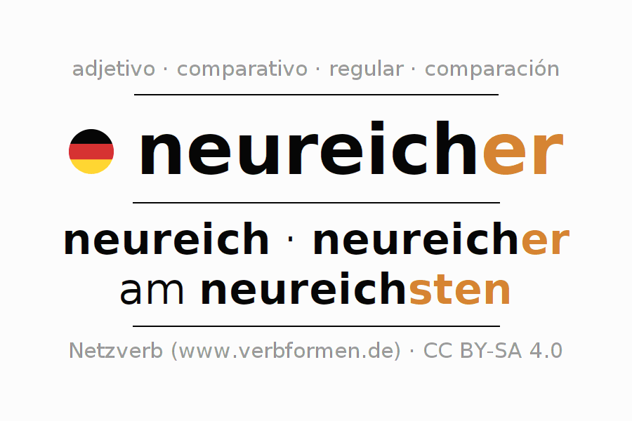 El comparativo en forma de tabla con todas sus formas de declinación: fuerte, débil y mixta. Estas están representadas de forma clara en una tabla sinópica en singular, plural y en los cuatro casos gramaticales: nominativo (primer caso), genitivo (segundo caso), dativo (tercer caso) y acusativo (cuarto caso). Aquí encontraras más información acerca del tema Wiktionary neureicher y aquí también a través del Duden neureicher.