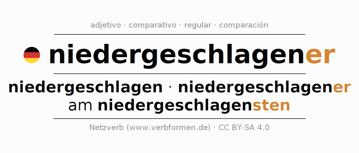 El comparativo en forma de tabla con todas sus formas de declinación: fuerte, débil y mixta. Estas están representadas de forma clara en una tabla sinópica en singular, plural y en los cuatro casos gramaticales: nominativo (primer caso), genitivo (segundo caso), dativo (tercer caso) y acusativo (cuarto caso). Aquí encontraras más información acerca del tema Wiktionary niedergeschlagener y aquí también a través del Duden niedergeschlagener.