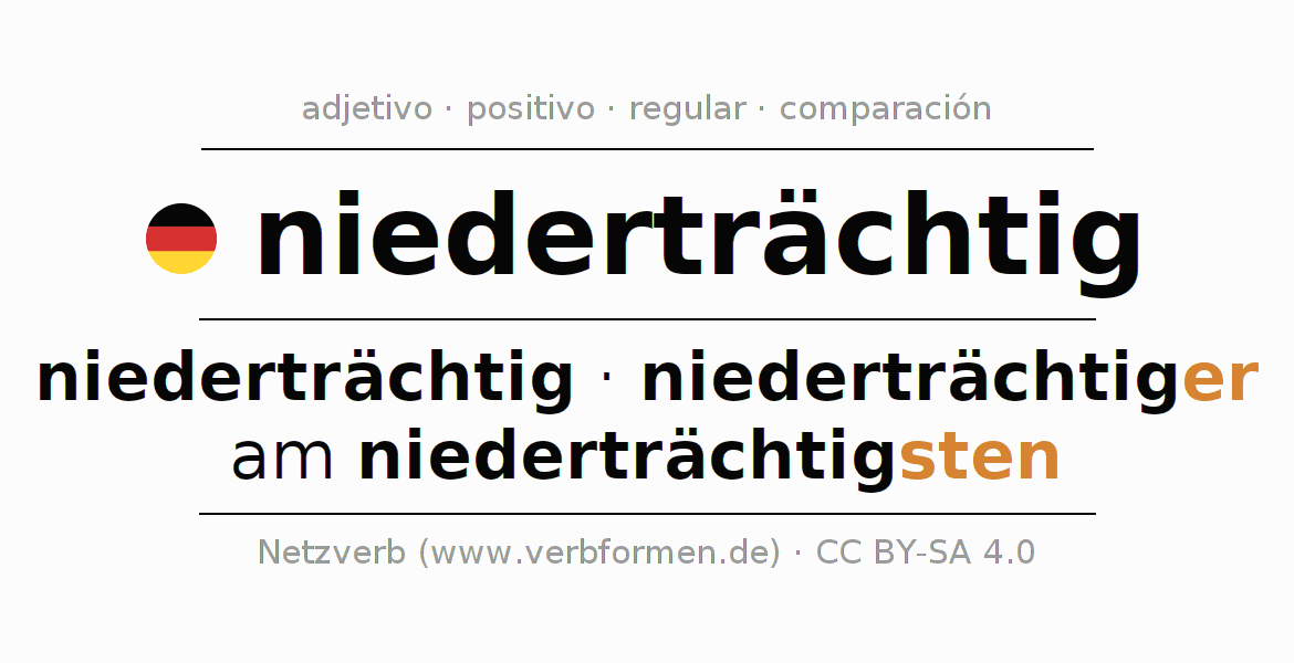 El comparativo en forma de tabla con todas sus formas de declinación: fuerte, débil y mixta. Estas están representadas de forma clara en una tabla sinópica en singular, plural y en los cuatro casos gramaticales: nominativo (primer caso), genitivo (segundo caso), dativo (tercer caso) y acusativo (cuarto caso). Aquí encontraras más información acerca del tema Wiktionary niederträchtig y aquí también a través del Duden niederträchtig.