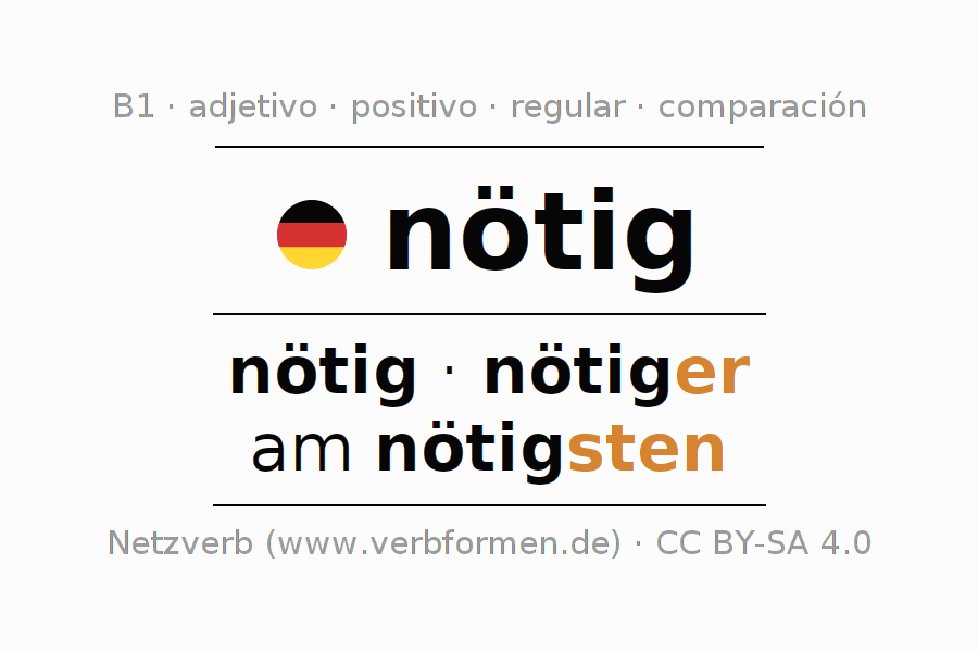 El adjetivo nötig se declina (necesario, urgente) utilizando las construcciones de comparación. Las terminaciones necesarias para la exaltación, comparación y el superlativo son er/sten. El adjetivo nötig puede ser utilizado de forma atributiva en frente de un sustantivo así como de forma predicativa en conjunto con un verbo.Aquí puedes declinar y comparar no solamente nötig sino también todos los adjetivos alemanes. Comentarios ☆