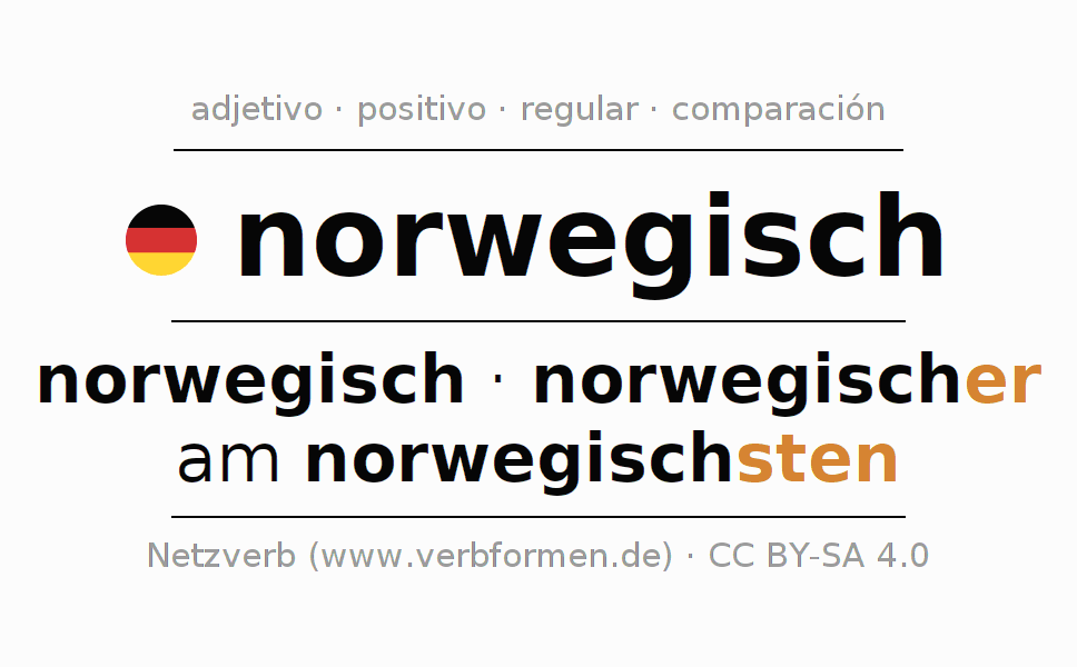 El adjetivo norwegisch se declina (noruego) utilizando las construcciones de comparación. Las terminaciones necesarias para la exaltación, comparación y el superlativo son er/sten. El adjetivo norwegisch puede ser utilizado de forma atributiva en frente de un sustantivo así como de forma predicativa en conjunto con un verbo.Aquí puedes declinar y comparar no solamente norwegisch sino también todos los adjetivos alemanes. Comentarios ☆