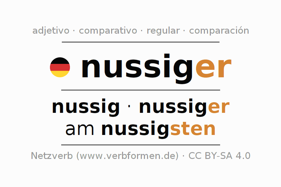El adjetivo nussiger se declina (con sabor a nuez, nuezoso) utilizando las construcciones de comparación. Las terminaciones necesarias para la exaltación, comparación y el superlativo son er/sten. El adjetivo nussiger puede ser utilizado de forma atributiva en frente de un sustantivo así como de forma predicativa en conjunto con un verbo.Aquí puedes declinar y comparar no solamente nussiger sino también todos los adjetivos alemanes. Comentarios ☆