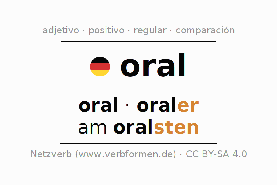 El adjetivo oral se declina utilizando las construcciones de comparación. Las terminaciones necesarias para la exaltación, comparación y el superlativo son er/sten. El adjetivo oral puede ser utilizado de forma atributiva en frente de un sustantivo así como de forma predicativa en conjunto con un verbo.Aquí puedes declinar y comparar no solamente oral sino también todos los adjetivos alemanes. Comentarios ☆