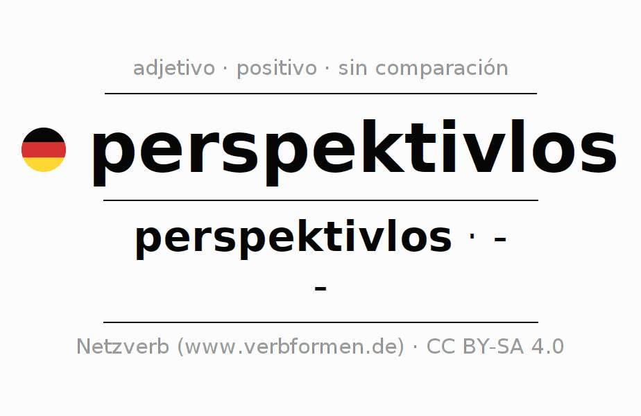 El adjetivo perspektivlos se declina (sin futuro, sin perspectiva) utilizando la construcción perspektivlos, la cual no puede ser exaltada, es decir este adjetivo no permite formas del comparativo o superlativo. El adjetivo perspektivlos puede ser utilizado de forma atributiva en frente de un sustantivo así como de forma predicativa en conjunto con un verbo.Aquí puedes declinar y comparar no solamente perspektivlos sino también todos los adjetivos alemanes. Comentarios ☆