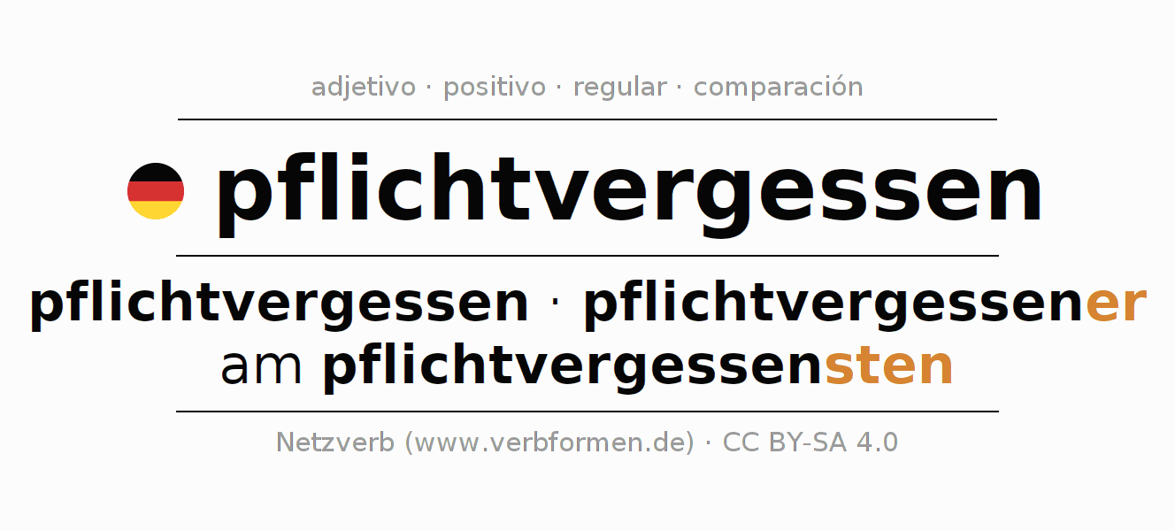 El comparativo en forma de tabla con todas sus formas de declinación: fuerte, débil y mixta. Estas están representadas de forma clara en una tabla sinópica en singular, plural y en los cuatro casos gramaticales: nominativo (primer caso), genitivo (segundo caso), dativo (tercer caso) y acusativo (cuarto caso). Aquí encontraras más información acerca del tema Wiktionary pflichtvergessen y aquí también a través del Duden pflichtvergessen.