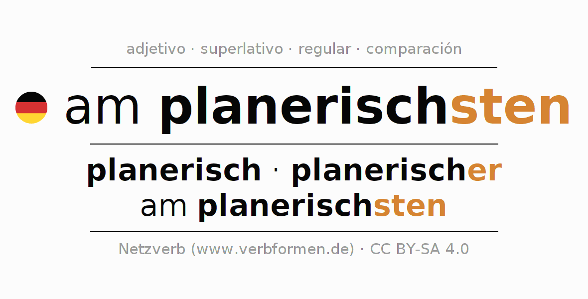 El comparativo en forma de tabla con todas sus formas de declinación: fuerte, débil y mixta. Estas están representadas de forma clara en una tabla sinópica en singular, plural y en los cuatro casos gramaticales: nominativo (primer caso), genitivo (segundo caso), dativo (tercer caso) y acusativo (cuarto caso). Aquí encontraras más información acerca del tema Wiktionary am planerischsten y aquí también a través del Duden am planerischsten.
