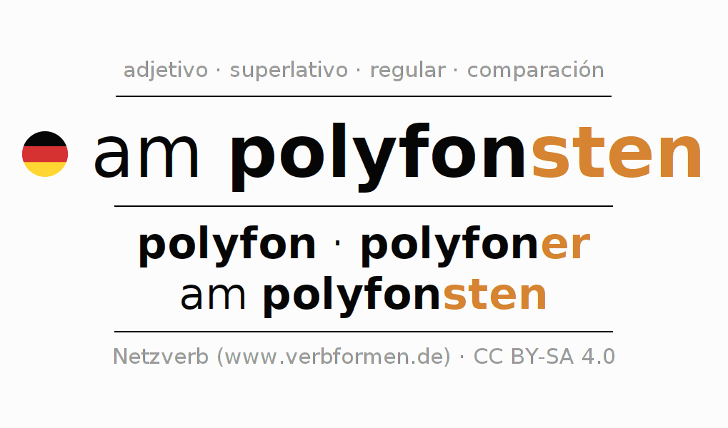El adjetivo am polyfonsten se declina (polifónico) utilizando las construcciones de comparación. Las terminaciones necesarias para la exaltación, comparación y el superlativo son er/sten. El adjetivo am polyfonsten puede ser utilizado de forma atributiva en frente de un sustantivo así como de forma predicativa en conjunto con un verbo.Aquí puedes declinar y comparar no solamente am polyfonsten sino también todos los adjetivos alemanes. Comentarios ☆