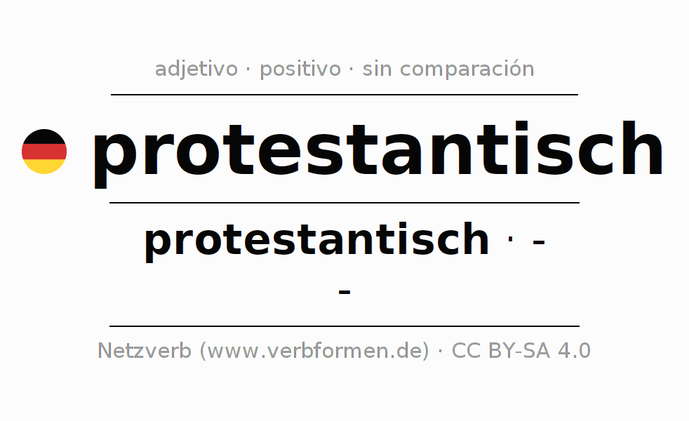 El adjetivo protestantisch se declina (protestante) utilizando la construcción protestantisch, la cual no puede ser exaltada, es decir este adjetivo no permite formas del comparativo o superlativo. El adjetivo protestantisch puede ser utilizado de forma atributiva en frente de un sustantivo así como de forma predicativa en conjunto con un verbo.Aquí puedes declinar y comparar no solamente protestantisch sino también todos los adjetivos alemanes. Comentarios ☆