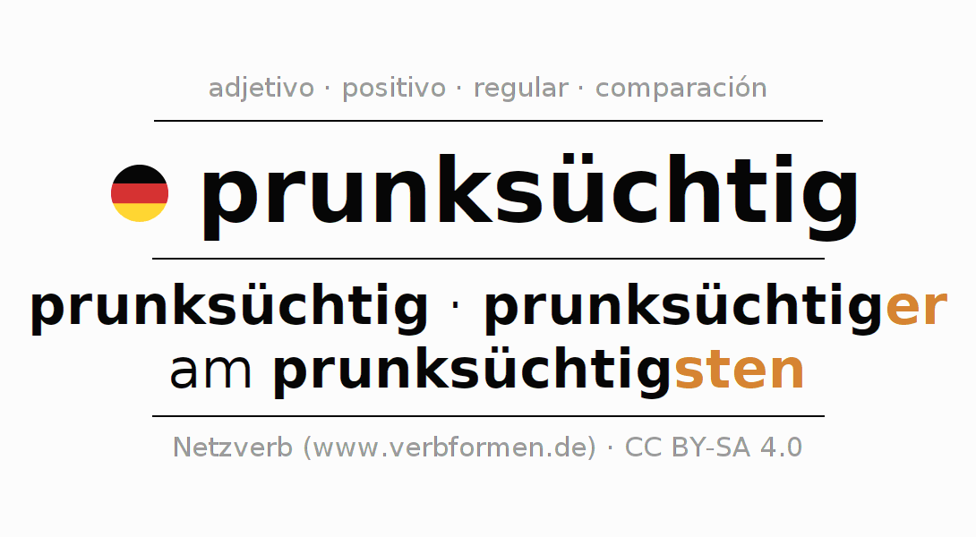 El comparativo en forma de tabla con todas sus formas de declinación: fuerte, débil y mixta. Estas están representadas de forma clara en una tabla sinópica en singular, plural y en los cuatro casos gramaticales: nominativo (primer caso), genitivo (segundo caso), dativo (tercer caso) y acusativo (cuarto caso). Aquí encontraras más información acerca del tema Wiktionary prunksüchtig y aquí también a través del Duden prunksüchtig.