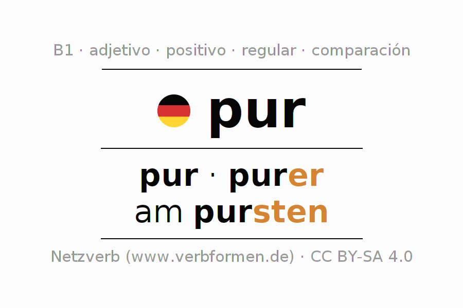 El adjetivo pur se declina (puro) utilizando las construcciones de comparación. Las terminaciones necesarias para la exaltación, comparación y el superlativo son er/sten. El adjetivo pur puede ser utilizado de forma atributiva en frente de un sustantivo así como de forma predicativa en conjunto con un verbo.Aquí puedes declinar y comparar no solamente pur sino también todos los adjetivos alemanes. Comentarios ☆