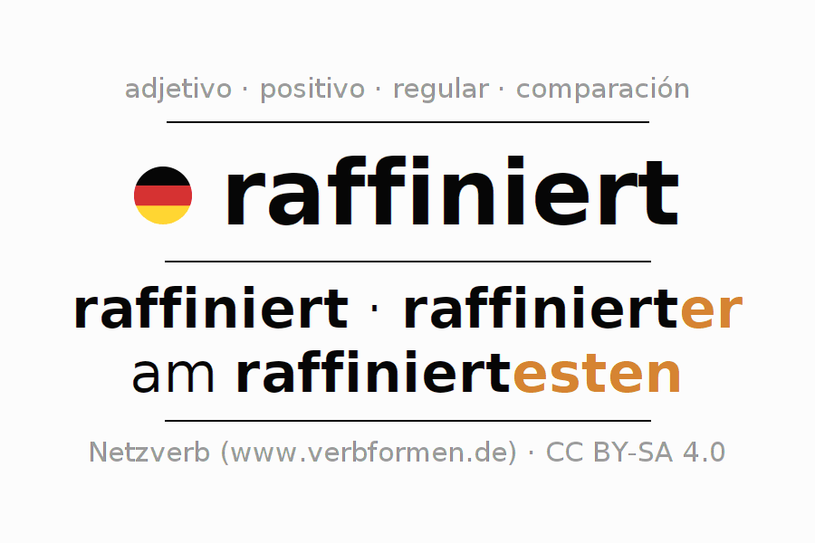 El comparativo en forma de tabla con todas sus formas de declinación: fuerte, débil y mixta. Estas están representadas de forma clara en una tabla sinópica en singular, plural y en los cuatro casos gramaticales: nominativo (primer caso), genitivo (segundo caso), dativo (tercer caso) y acusativo (cuarto caso). Aquí encontraras más información acerca del tema Wiktionary raffiniert y aquí también a través del Duden raffiniert.