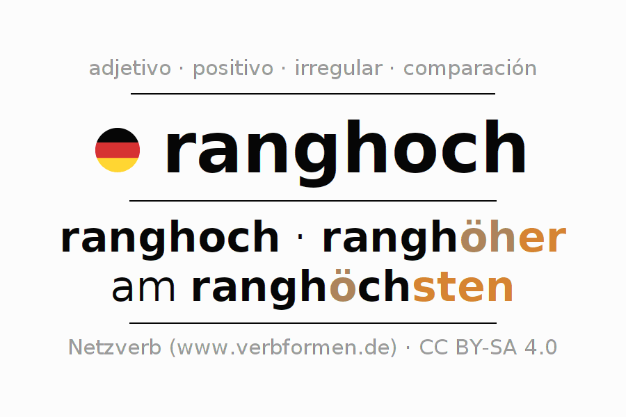 El adjetivo ranghoch se declina (de alto rango, alto) utilizando las construcciones de comparación. Las terminaciones necesarias para la exaltación, comparación y el superlativo son ö-er/ö-sten. El adjetivo ranghoch puede ser utilizado de forma atributiva en frente de un sustantivo así como de forma predicativa en conjunto con un verbo.Aquí puedes declinar y comparar no solamente ranghoch sino también todos los adjetivos alemanes. Comentarios ☆
