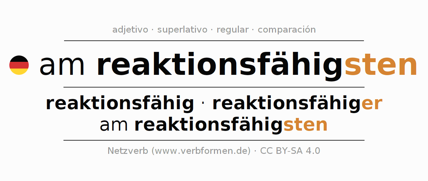 El comparativo en forma de tabla con todas sus formas de declinación: fuerte, débil y mixta. Estas están representadas de forma clara en una tabla sinópica en singular, plural y en los cuatro casos gramaticales: nominativo (primer caso), genitivo (segundo caso), dativo (tercer caso) y acusativo (cuarto caso). Aquí encontraras más información acerca del tema Wiktionary am reaktionsfähigsten y aquí también a través del Duden am reaktionsfähigsten.