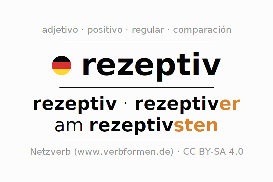El adjetivo rezeptiv se declina (receptivo) utilizando las construcciones de comparación. Las terminaciones necesarias para la exaltación, comparación y el superlativo son er/sten. El adjetivo rezeptiv puede ser utilizado de forma atributiva en frente de un sustantivo así como de forma predicativa en conjunto con un verbo.Aquí puedes declinar y comparar no solamente rezeptiv sino también todos los adjetivos alemanes. Comentarios ☆