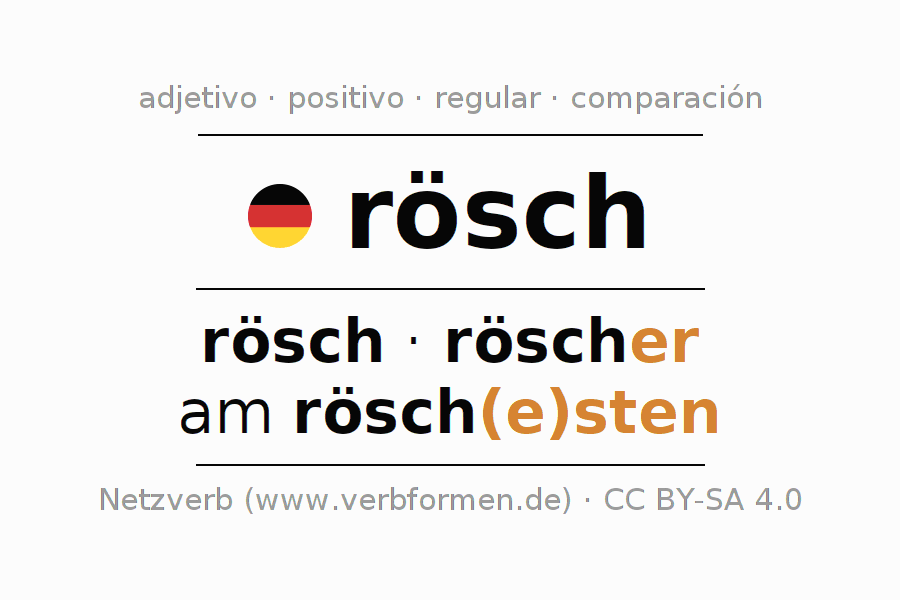 El comparativo en forma de tabla con todas sus formas de declinación: fuerte, débil y mixta. Estas están representadas de forma clara en una tabla sinópica en singular, plural y en los cuatro casos gramaticales: nominativo (primer caso), genitivo (segundo caso), dativo (tercer caso) y acusativo (cuarto caso). Aquí encontraras más información acerca del tema Wiktionary rösch y aquí también a través del Duden rösch.