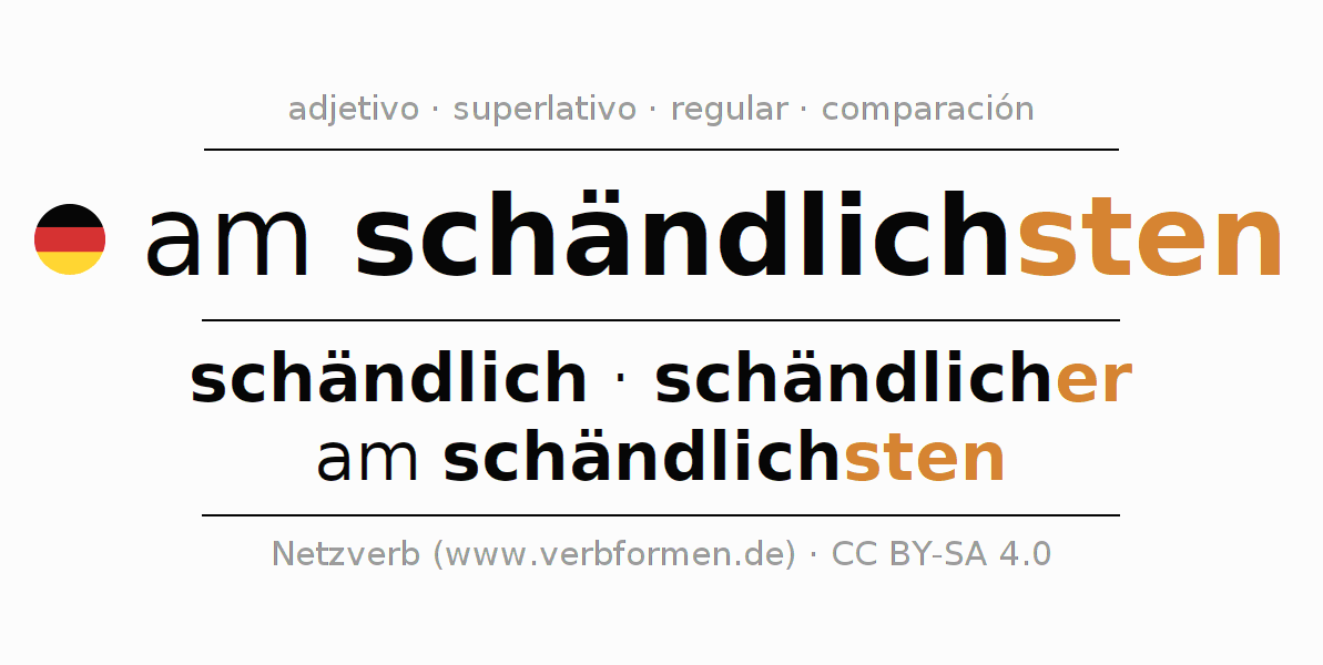 El comparativo en forma de tabla con todas sus formas de declinación: fuerte, débil y mixta. Estas están representadas de forma clara en una tabla sinópica en singular, plural y en los cuatro casos gramaticales: nominativo (primer caso), genitivo (segundo caso), dativo (tercer caso) y acusativo (cuarto caso). Aquí encontraras más información acerca del tema Wiktionary am schändlichsten y aquí también a través del Duden am schändlichsten.
