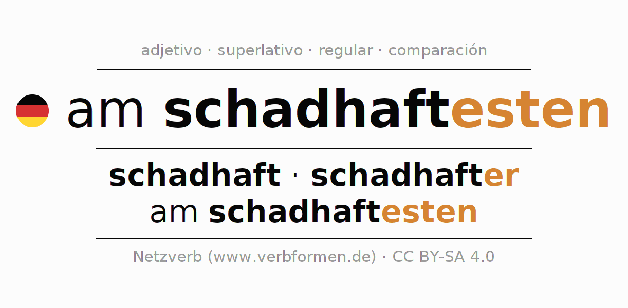 El comparativo en forma de tabla con todas sus formas de declinación: fuerte, débil y mixta. Estas están representadas de forma clara en una tabla sinópica en singular, plural y en los cuatro casos gramaticales: nominativo (primer caso), genitivo (segundo caso), dativo (tercer caso) y acusativo (cuarto caso). Aquí encontraras más información acerca del tema Wiktionary am schadhaftesten y aquí también a través del Duden am schadhaftesten.