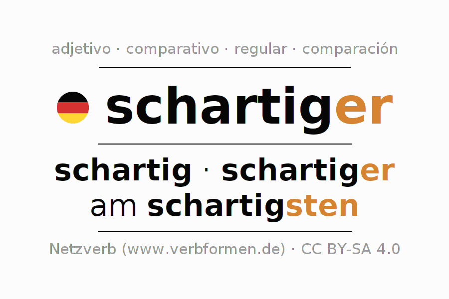 El comparativo en forma de tabla con todas sus formas de declinación: fuerte, débil y mixta. Estas están representadas de forma clara en una tabla sinópica en singular, plural y en los cuatro casos gramaticales: nominativo (primer caso), genitivo (segundo caso), dativo (tercer caso) y acusativo (cuarto caso). Aquí encontraras más información acerca del tema Wiktionary schartiger y aquí también a través del Duden schartiger.