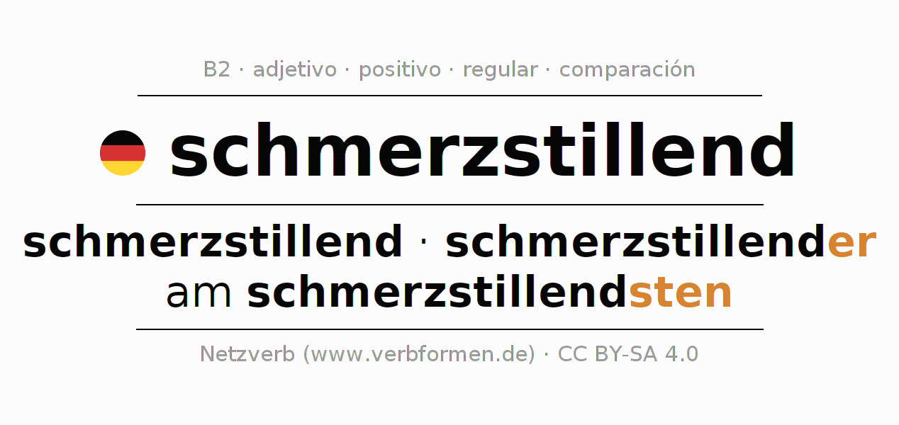 El comparativo en forma de tabla con todas sus formas de declinación: fuerte, débil y mixta. Estas están representadas de forma clara en una tabla sinópica en singular, plural y en los cuatro casos gramaticales: nominativo (primer caso), genitivo (segundo caso), dativo (tercer caso) y acusativo (cuarto caso). Aquí encontraras más información acerca del tema Wiktionary schmerzstillend y aquí también a través del Duden schmerzstillend.