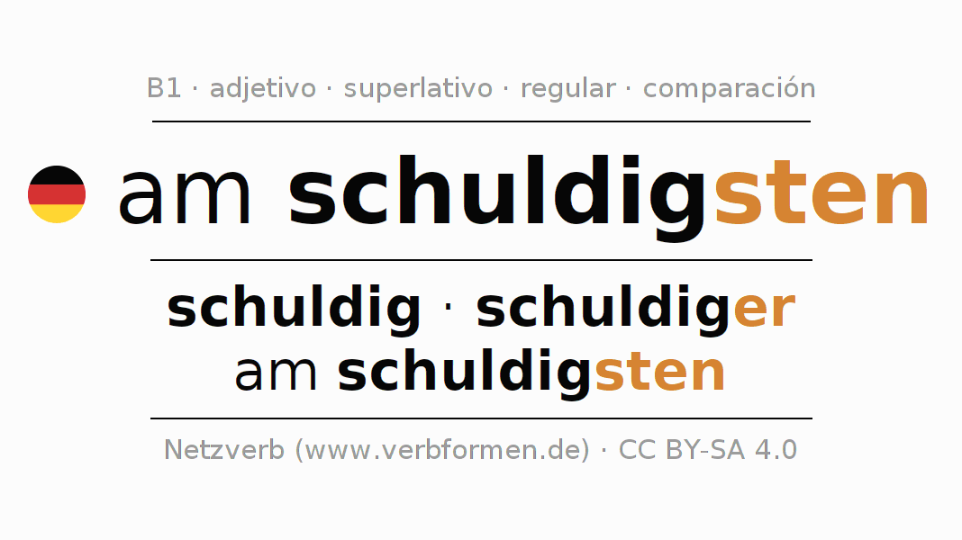 El comparativo en forma de tabla con todas sus formas de declinación: fuerte, débil y mixta. Estas están representadas de forma clara en una tabla sinópica en singular, plural y en los cuatro casos gramaticales: nominativo (primer caso), genitivo (segundo caso), dativo (tercer caso) y acusativo (cuarto caso). Aquí encontraras más información acerca del tema Wiktionary am schuldigsten y aquí también a través del Duden am schuldigsten.