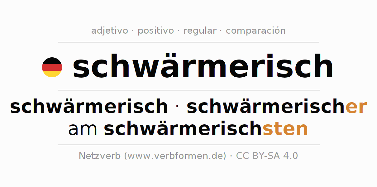 El adjetivo schwärmerisch se declina (idealista, soñador) utilizando las construcciones de comparación. Las terminaciones necesarias para la exaltación, comparación y el superlativo son er/sten. El adjetivo schwärmerisch puede ser utilizado de forma atributiva en frente de un sustantivo así como de forma predicativa en conjunto con un verbo.Aquí puedes declinar y comparar no solamente schwärmerisch sino también todos los adjetivos alemanes. Comentarios ☆