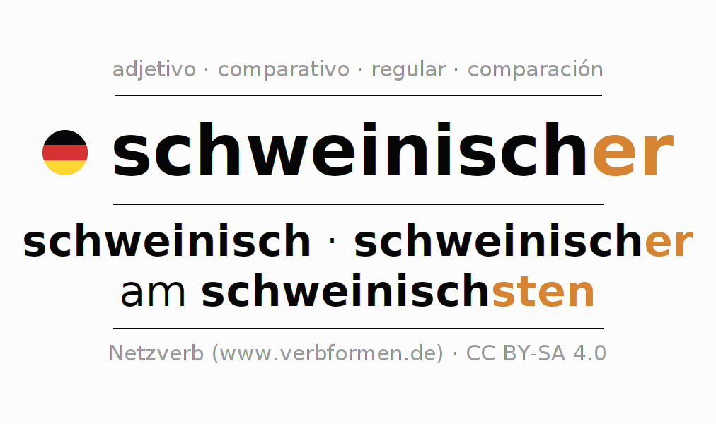 El comparativo en forma de tabla con todas sus formas de declinación: fuerte, débil y mixta. Estas están representadas de forma clara en una tabla sinópica en singular, plural y en los cuatro casos gramaticales: nominativo (primer caso), genitivo (segundo caso), dativo (tercer caso) y acusativo (cuarto caso). Aquí encontraras más información acerca del tema Wiktionary schweinischer y aquí también a través del Duden schweinischer.
