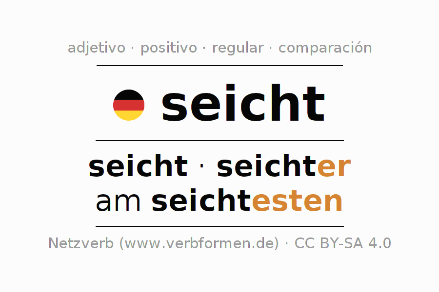 El comparativo en forma de tabla con todas sus formas de declinación: fuerte, débil y mixta. Estas están representadas de forma clara en una tabla sinópica en singular, plural y en los cuatro casos gramaticales: nominativo (primer caso), genitivo (segundo caso), dativo (tercer caso) y acusativo (cuarto caso). Aquí encontraras más información acerca del tema Wiktionary seicht y aquí también a través del Duden seicht.