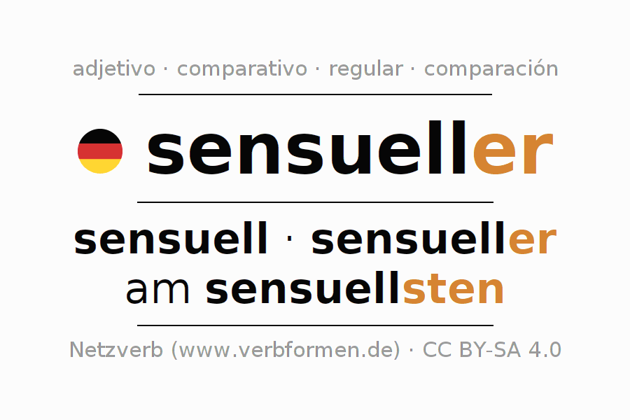 El adjetivo sensueller se declina (sensual) utilizando las construcciones de comparación. Las terminaciones necesarias para la exaltación, comparación y el superlativo son er/sten. El adjetivo sensueller puede ser utilizado de forma atributiva en frente de un sustantivo así como de forma predicativa en conjunto con un verbo.Aquí puedes declinar y comparar no solamente sensueller sino también todos los adjetivos alemanes. Comentarios ☆