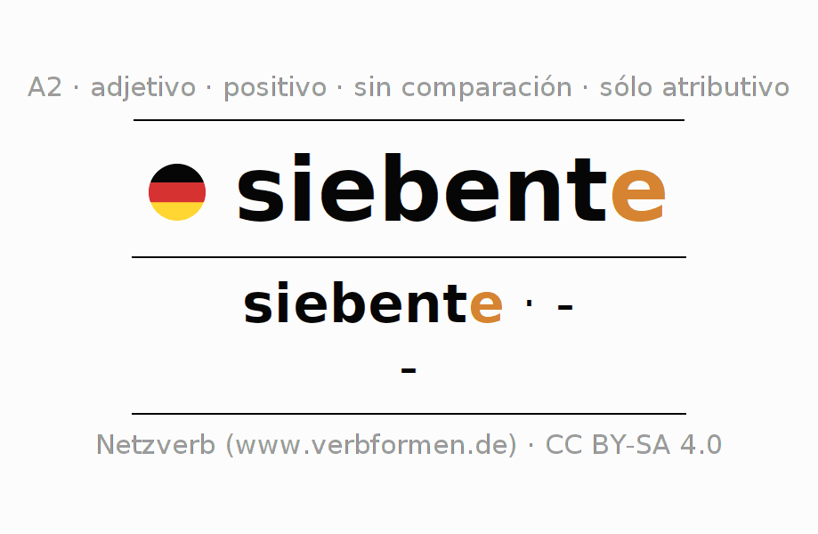 El adjetivo siebente se declina (séptimo) utilizando la construcción siebente, la cual no puede ser exaltada, es decir este adjetivo no permite formas del comparativo o superlativo. El adjetivo siebente puede ser declinado de forma atributiva solamente cuando aparece en frente de un sustantivo, ya sea con o sin artículo, y con declinación fuerte, débil y mixta de acuerdo a cada caso. Sin embargo el mismo adjetivo no puede ser utilizado de forma predicativa en conjunto con un verbo.Aquí puedes declinar y comparar no solamente siebente sino también todos los adjetivos alemanes. Comentarios ☆