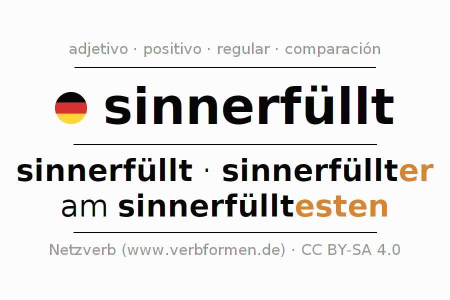 El adjetivo sinnerfüllt se declina (pleno de significado, significativo) utilizando las construcciones de comparación. Las terminaciones necesarias para la exaltación, comparación y el superlativo son er/esten. El adjetivo sinnerfüllt puede ser utilizado de forma atributiva en frente de un sustantivo así como de forma predicativa en conjunto con un verbo.Aquí puedes declinar y comparar no solamente sinnerfüllt sino también todos los adjetivos alemanes. Comentarios ☆