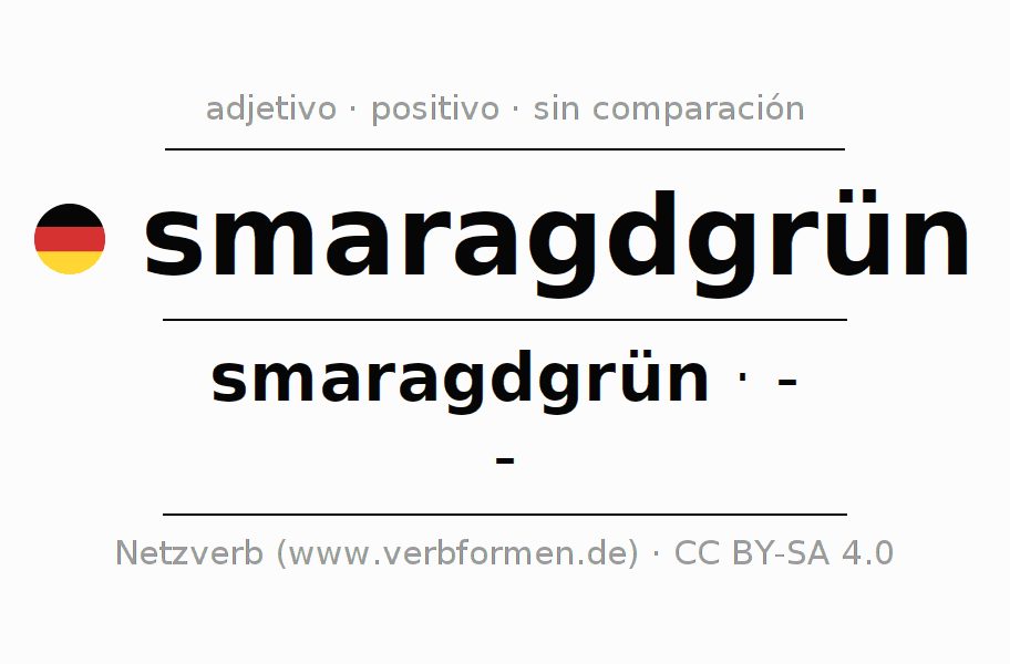 El comparativo en forma de tabla con todas sus formas de declinación: fuerte, débil y mixta. Estas están representadas de forma clara en una tabla sinópica en singular, plural y en los cuatro casos gramaticales: nominativo (primer caso), genitivo (segundo caso), dativo (tercer caso) y acusativo (cuarto caso). Aquí encontraras más información acerca del tema Wiktionary smaragdgrün y aquí también a través del Duden smaragdgrün.