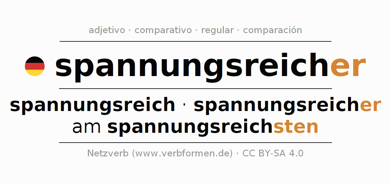 El comparativo en forma de tabla con todas sus formas de declinación: fuerte, débil y mixta. Estas están representadas de forma clara en una tabla sinópica en singular, plural y en los cuatro casos gramaticales: nominativo (primer caso), genitivo (segundo caso), dativo (tercer caso) y acusativo (cuarto caso). Aquí encontraras más información acerca del tema Wiktionary spannungsreicher y aquí también a través del Duden spannungsreicher.