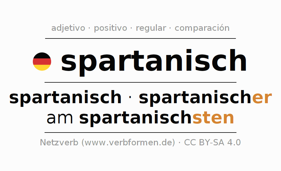 El adjetivo spartanisch se declina (espartano, sobrio) utilizando las construcciones de comparación. Las terminaciones necesarias para la exaltación, comparación y el superlativo son er/sten. El adjetivo spartanisch puede ser utilizado de forma atributiva en frente de un sustantivo así como de forma predicativa en conjunto con un verbo.Aquí puedes declinar y comparar no solamente spartanisch sino también todos los adjetivos alemanes. Comentarios ☆