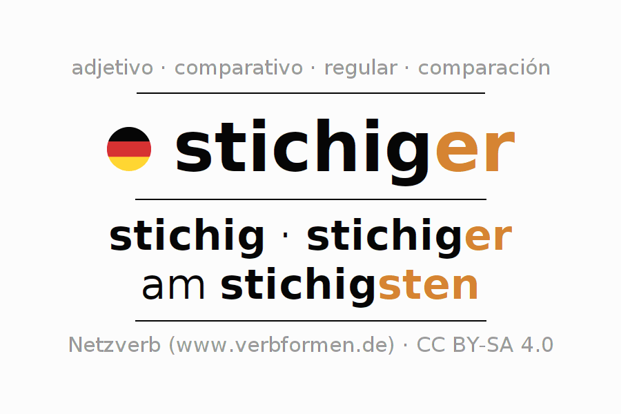 El comparativo en forma de tabla con todas sus formas de declinación: fuerte, débil y mixta. Estas están representadas de forma clara en una tabla sinópica en singular, plural y en los cuatro casos gramaticales: nominativo (primer caso), genitivo (segundo caso), dativo (tercer caso) y acusativo (cuarto caso). Aquí encontraras más información acerca del tema Wiktionary stichiger y aquí también a través del Duden stichiger.
