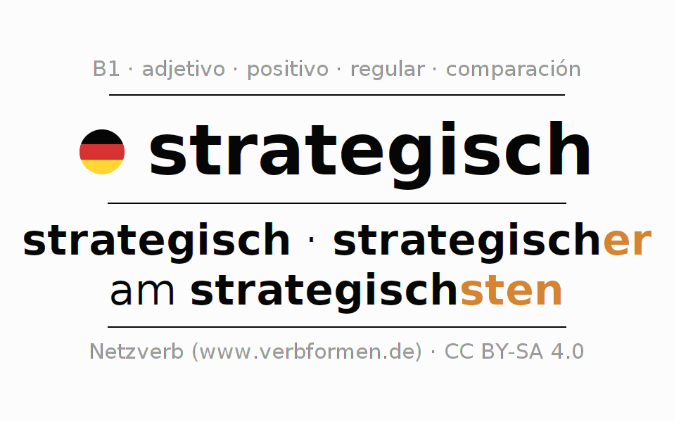 El comparativo en forma de tabla con todas sus formas de declinación: fuerte, débil y mixta. Estas están representadas de forma clara en una tabla sinópica en singular, plural y en los cuatro casos gramaticales: nominativo (primer caso), genitivo (segundo caso), dativo (tercer caso) y acusativo (cuarto caso). Aquí encontraras más información acerca del tema Wiktionary strategisch y aquí también a través del Duden strategisch.