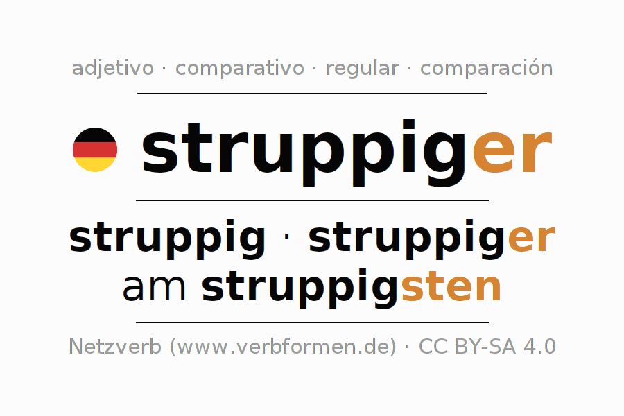 El comparativo en forma de tabla con todas sus formas de declinación: fuerte, débil y mixta. Estas están representadas de forma clara en una tabla sinópica en singular, plural y en los cuatro casos gramaticales: nominativo (primer caso), genitivo (segundo caso), dativo (tercer caso) y acusativo (cuarto caso). Aquí encontraras más información acerca del tema Wiktionary struppiger y aquí también a través del Duden struppiger.