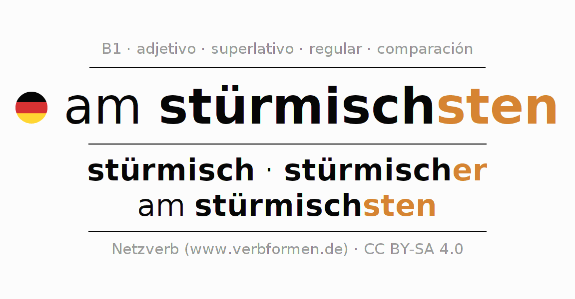 El comparativo en forma de tabla con todas sus formas de declinación: fuerte, débil y mixta. Estas están representadas de forma clara en una tabla sinópica en singular, plural y en los cuatro casos gramaticales: nominativo (primer caso), genitivo (segundo caso), dativo (tercer caso) y acusativo (cuarto caso). Aquí encontraras más información acerca del tema Wiktionary am stürmischsten y aquí también a través del Duden am stürmischsten.