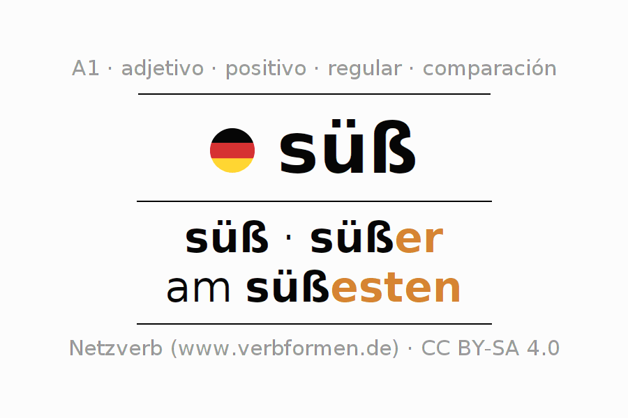 El comparativo en forma de tabla con todas sus formas de declinación: fuerte, débil y mixta. Estas están representadas de forma clara en una tabla sinópica en singular, plural y en los cuatro casos gramaticales: nominativo (primer caso), genitivo (segundo caso), dativo (tercer caso) y acusativo (cuarto caso). Aquí encontraras más información acerca del tema Wiktionary süß y aquí también a través del Duden süß.