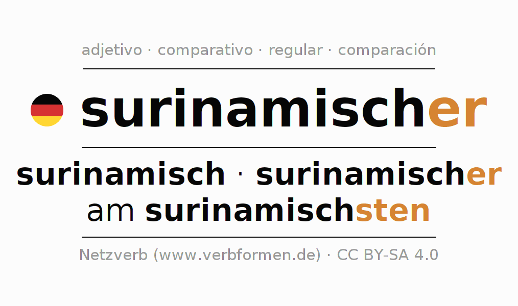 El adjetivo surinamischer se declina (sranan tongo, surinamés) utilizando las construcciones de comparación. Las terminaciones necesarias para la exaltación, comparación y el superlativo son er/sten. El adjetivo surinamischer puede ser utilizado de forma atributiva en frente de un sustantivo así como de forma predicativa en conjunto con un verbo.Aquí puedes declinar y comparar no solamente surinamischer sino también todos los adjetivos alemanes. Comentarios ☆