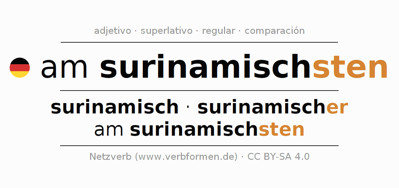 El comparativo en forma de tabla con todas sus formas de declinación: fuerte, débil y mixta. Estas están representadas de forma clara en una tabla sinópica en singular, plural y en los cuatro casos gramaticales: nominativo (primer caso), genitivo (segundo caso), dativo (tercer caso) y acusativo (cuarto caso). Aquí encontraras más información acerca del tema Wiktionary am surinamischsten y aquí también a través del Duden am surinamischsten.