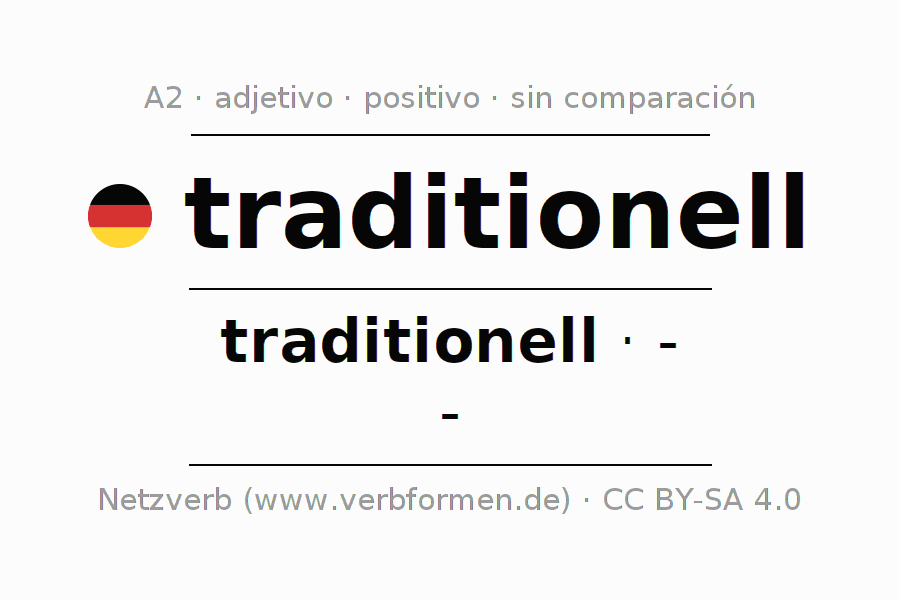 El adjetivo traditionell se declina (tradicional) utilizando la construcción traditionell, la cual no puede ser exaltada, es decir este adjetivo no permite formas del comparativo o superlativo. El adjetivo traditionell puede ser utilizado de forma atributiva en frente de un sustantivo así como de forma predicativa en conjunto con un verbo.Aquí puedes declinar y comparar no solamente traditionell sino también todos los adjetivos alemanes. Comentarios ☆