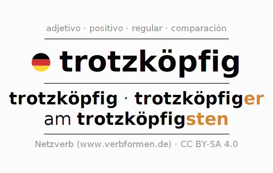 El comparativo en forma de tabla con todas sus formas de declinación: fuerte, débil y mixta. Estas están representadas de forma clara en una tabla sinópica en singular, plural y en los cuatro casos gramaticales: nominativo (primer caso), genitivo (segundo caso), dativo (tercer caso) y acusativo (cuarto caso). Aquí encontraras más información acerca del tema Wiktionary trotzköpfig y aquí también a través del Duden trotzköpfig.