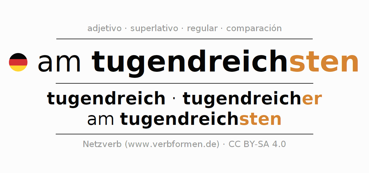 El comparativo en forma de tabla con todas sus formas de declinación: fuerte, débil y mixta. Estas están representadas de forma clara en una tabla sinópica en singular, plural y en los cuatro casos gramaticales: nominativo (primer caso), genitivo (segundo caso), dativo (tercer caso) y acusativo (cuarto caso). Aquí encontraras más información acerca del tema Wiktionary am tugendreichsten y aquí también a través del Duden am tugendreichsten.