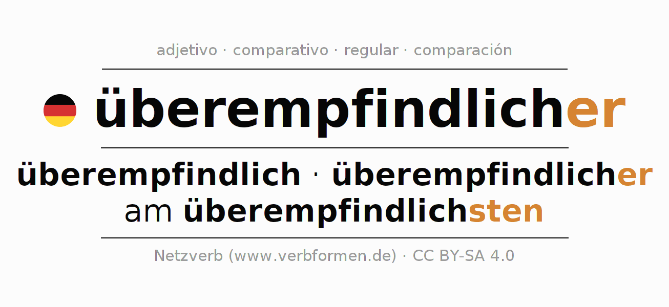 El comparativo en forma de tabla con todas sus formas de declinación: fuerte, débil y mixta. Estas están representadas de forma clara en una tabla sinópica en singular, plural y en los cuatro casos gramaticales: nominativo (primer caso), genitivo (segundo caso), dativo (tercer caso) y acusativo (cuarto caso). Aquí encontraras más información acerca del tema Wiktionary überempfindlicher y aquí también a través del Duden überempfindlicher.